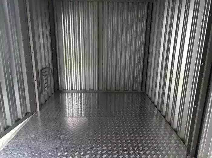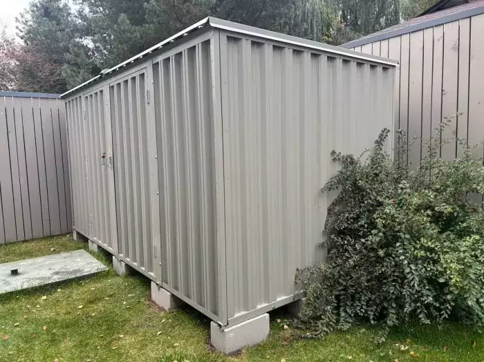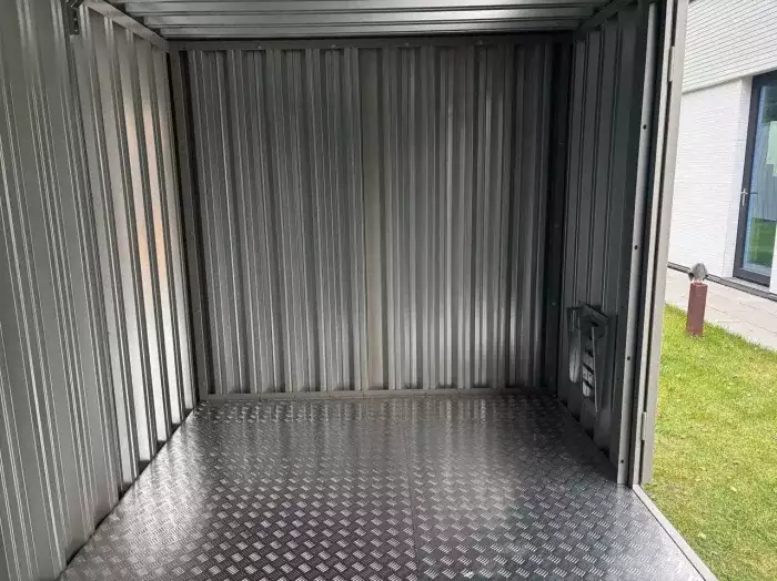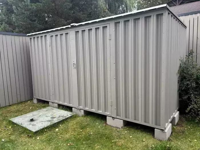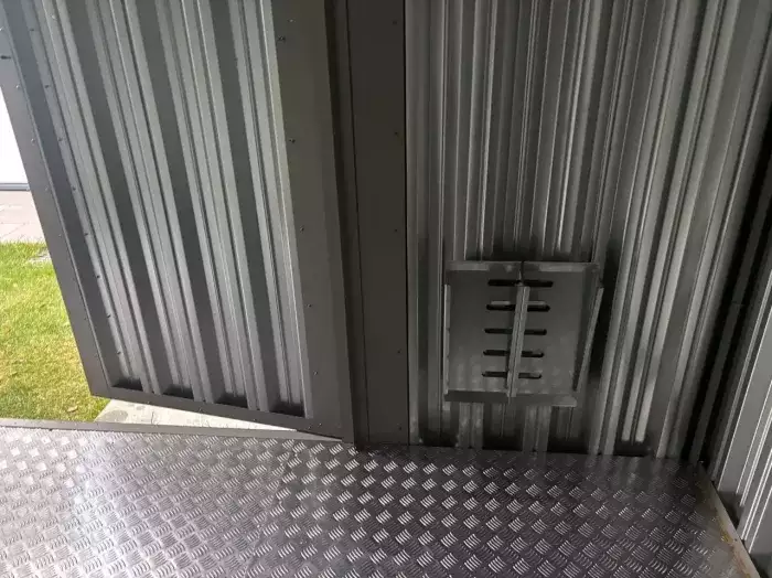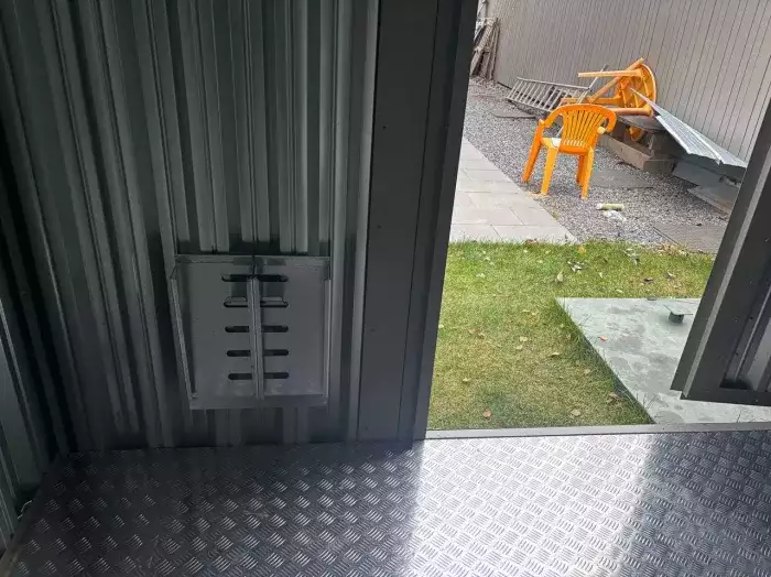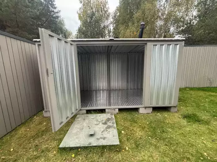 Ещё весной изготавливали нестандартную конструкцию с плоской крышей и торцевой входной группой для заказчика из города Тюмень. Использование постройки предполагалось в помещении склада под балками, поэтому у этой постройки не совсем стандартный размер – высота всего 1,8 м со скатом назад до 1,6 м. Окрас конструкция получила в белоснежный цвет 9003 из каталога RAL.