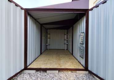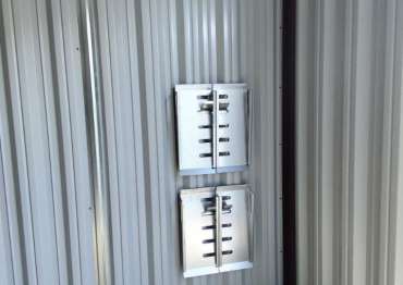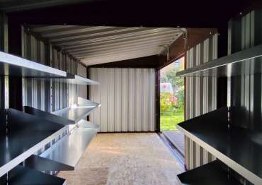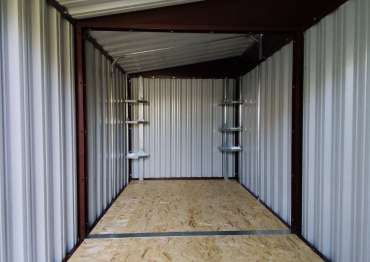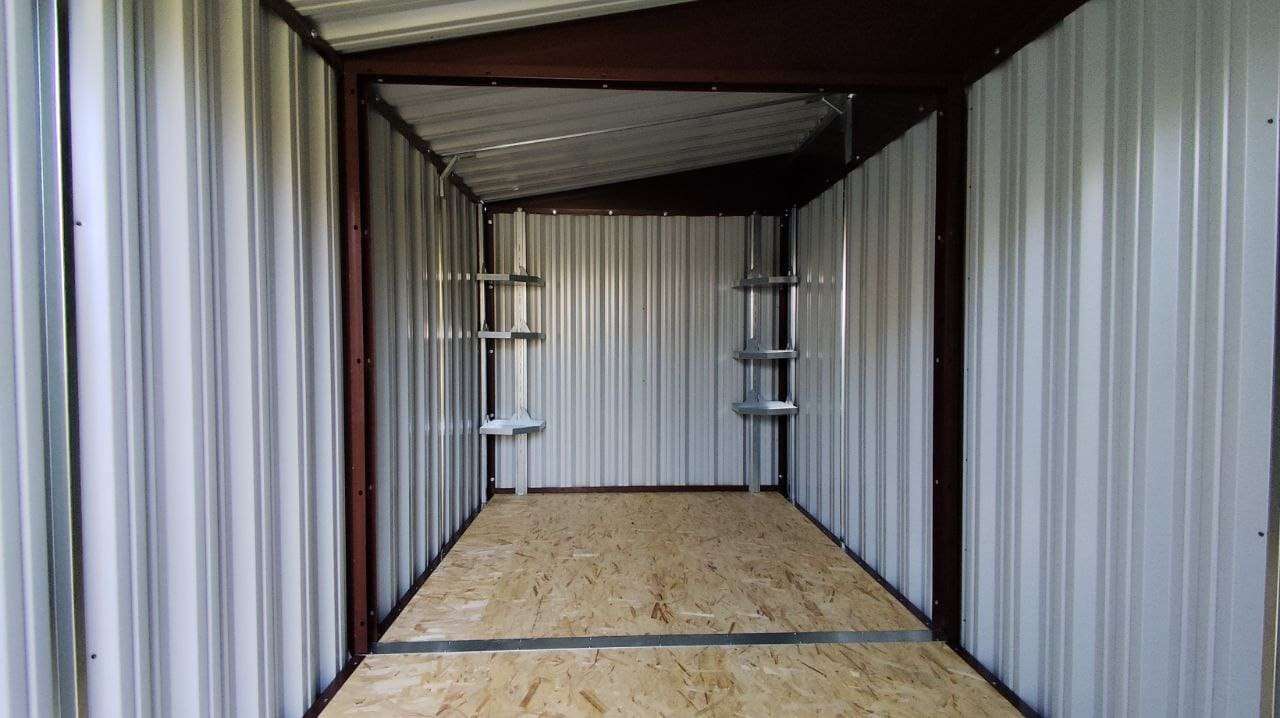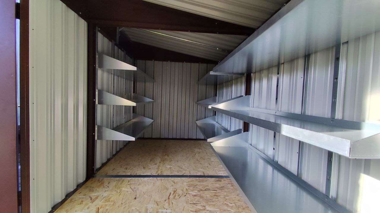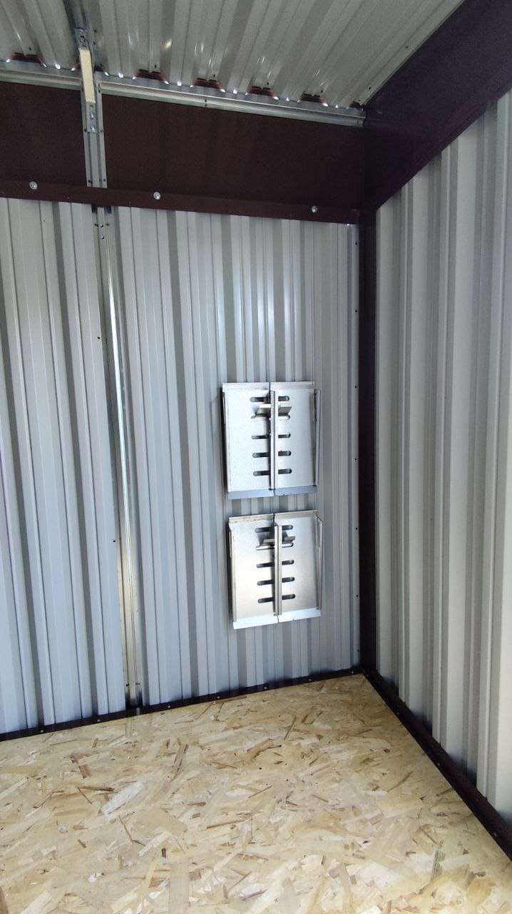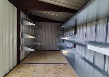 Для садового инвентаря нами была изготовлена стандартная 5-метровая конструкция с односкатной крышей и боковой воротной группой. Ее мы дополнительно оборудовали тремя стеллажами с тремя полками.