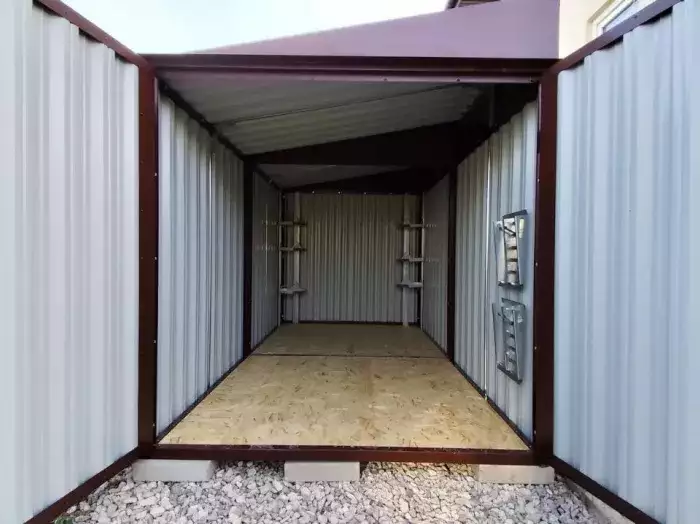 Нами была изготовлена широкая 6-метровая конструкция с увеличенной высотой 2,69 м с двускатной крышей и торцевой воротной группой в блестящем цинковом цвете.