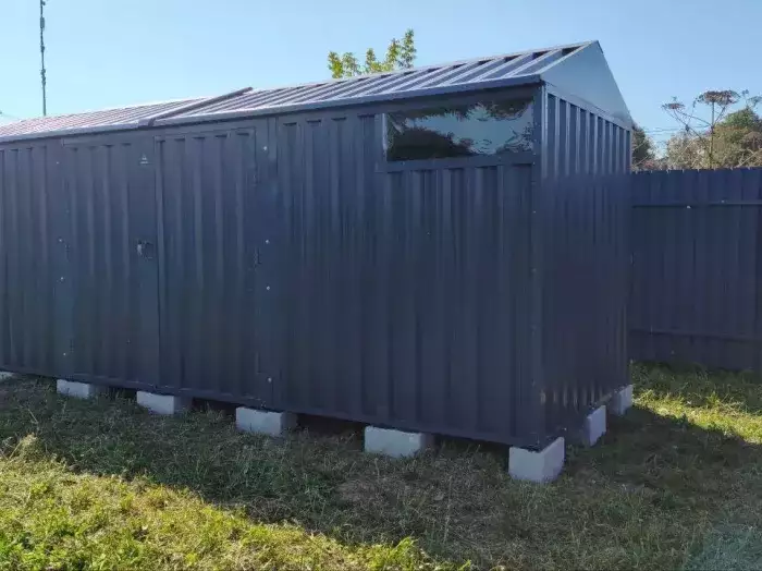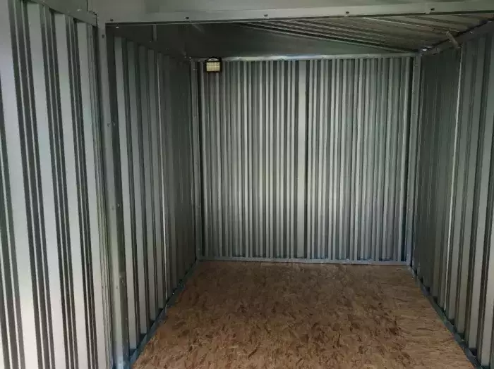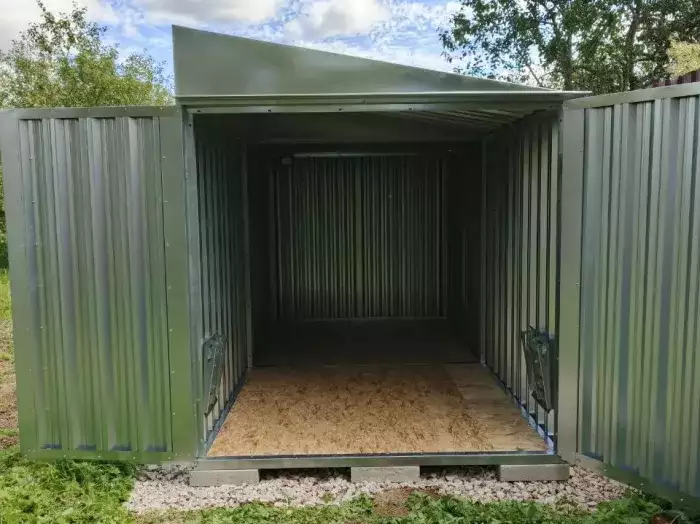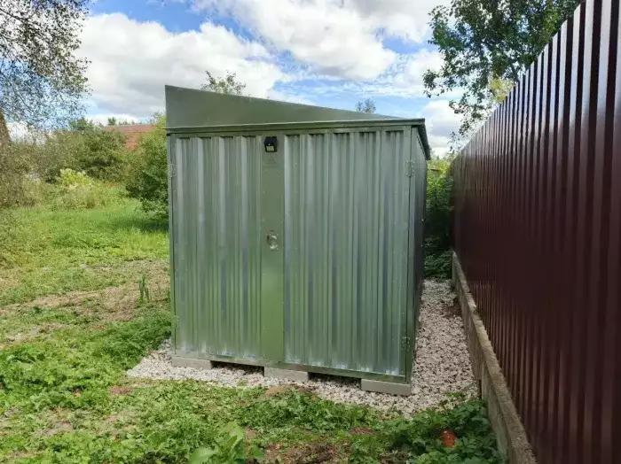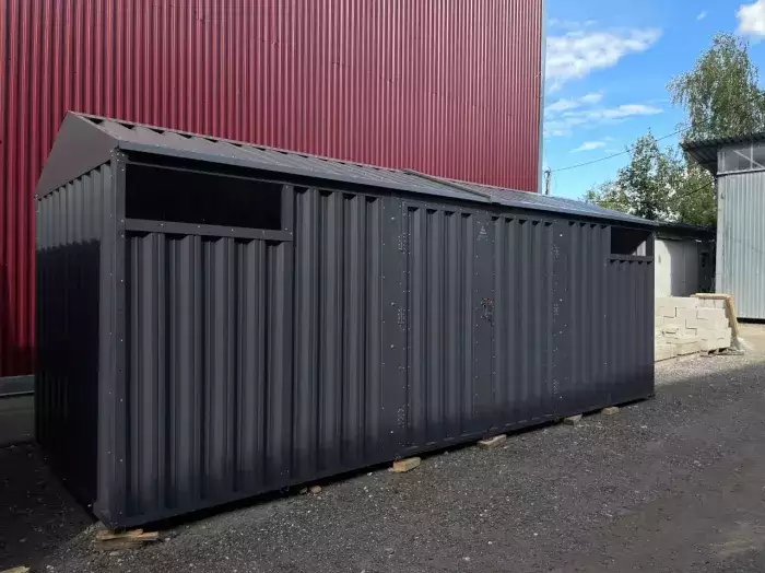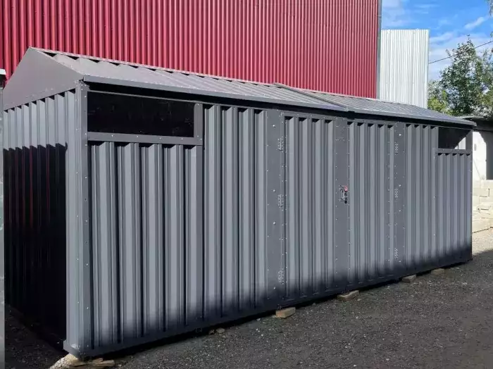 К нам поступил интересный заказ на изготовление 4-х метрового гаража для хранения инвентаря и мототехники SKOGGY с односкатной крышей, торцевой дверью в цветах RAL 7035 /7024 с индивидуальным принтом.