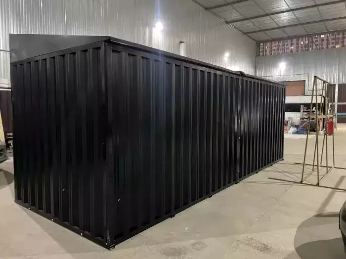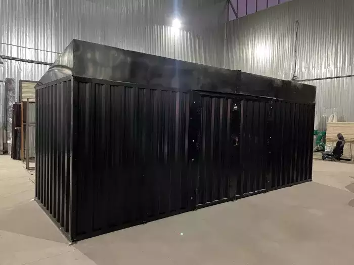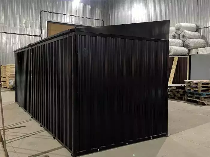 Нами была изготовлена стандартная 4-метровая конструкция с двускатной крышей и торцевой воротной группой в строгом брутальном цвете RAL 7024.