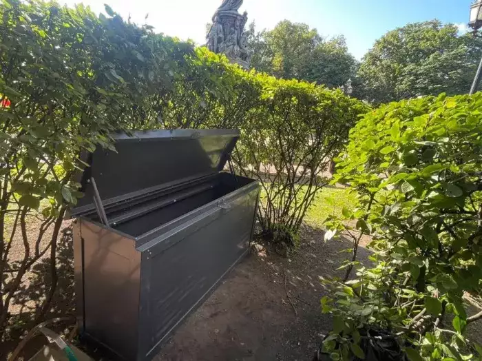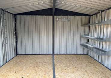 Дополнительно гараж оборудован системой хранения инвентаря, прямым стеллажом с тремя полками, системой подвесов и упорами для распашных ворот.