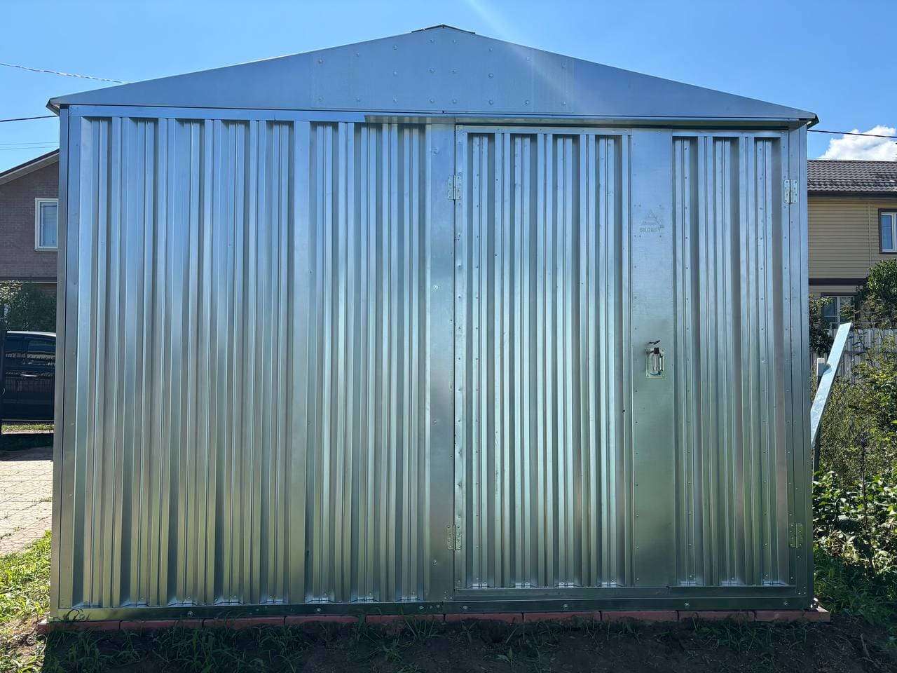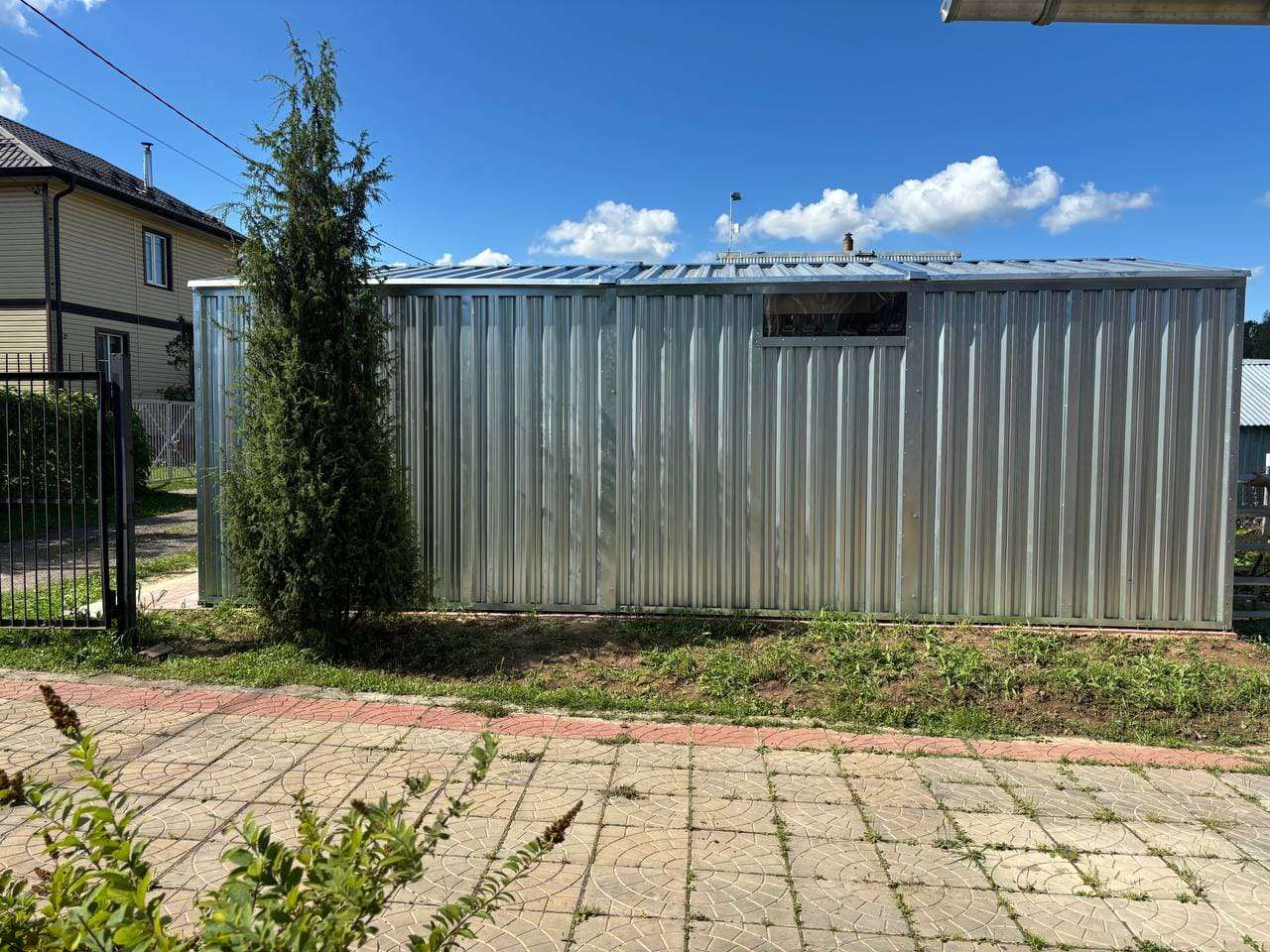 Нами была изготовлена конструкция размером 7 х 3,5 х 2,69 м с двускатной крышей и торцевой воротной группой в блестящем цинковом цвете.