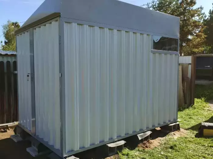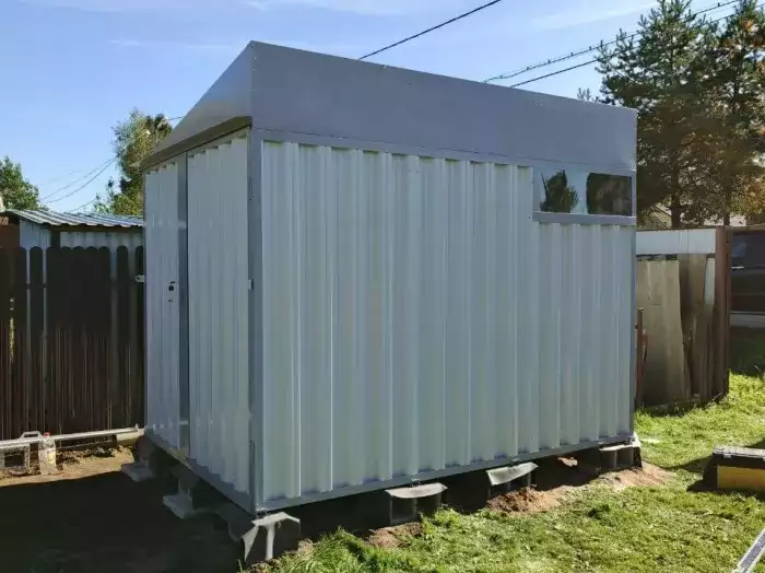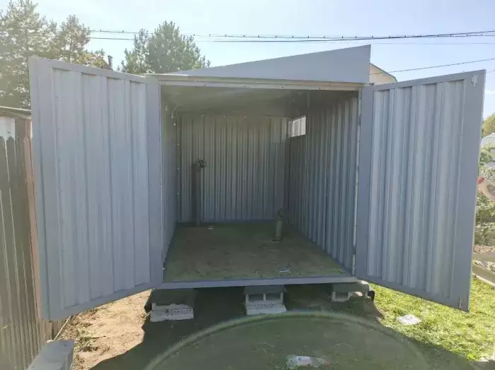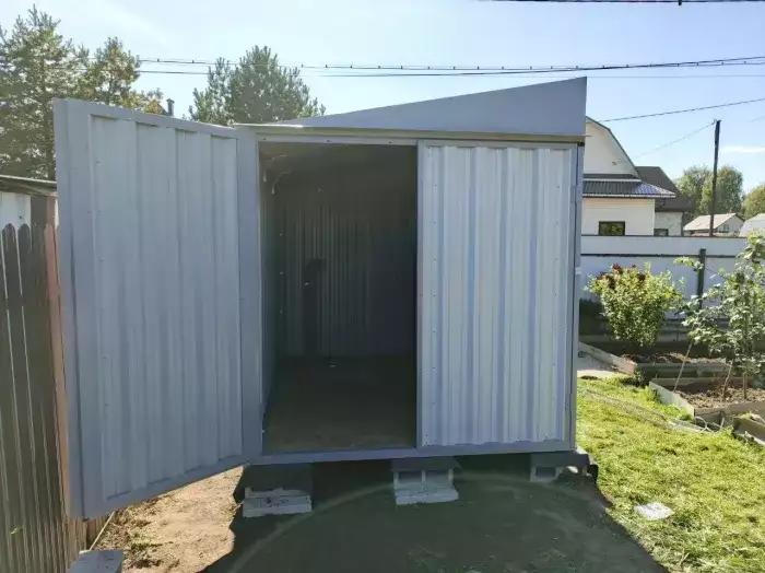 Нами была изготовлена стандартная 2-метровая конструкция с односкатной крышей и торцевой воротной группой в блестящем цинковом цвете.