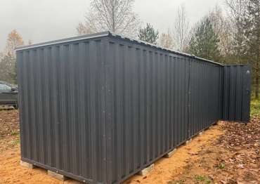 Нами была изготовлена стандартная 6-метровая конструкция с плоской крышей и двумя воротными группами (с боковой и торцевой сторон) в строгом графитовом цвете RAL 7024.