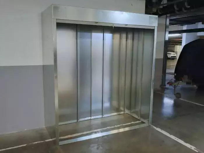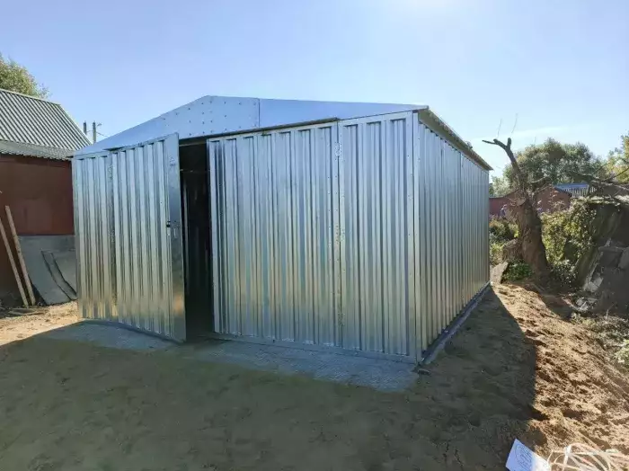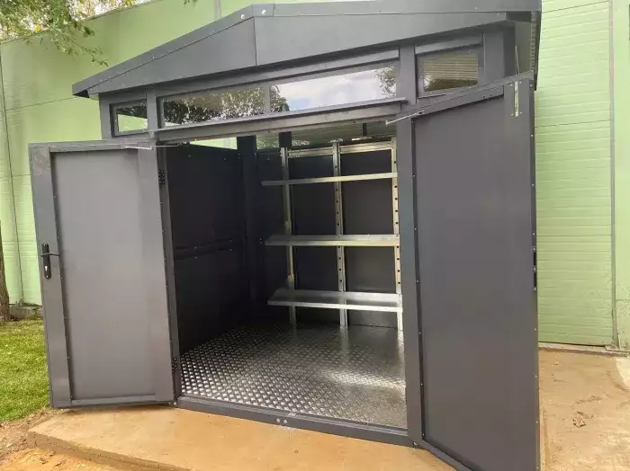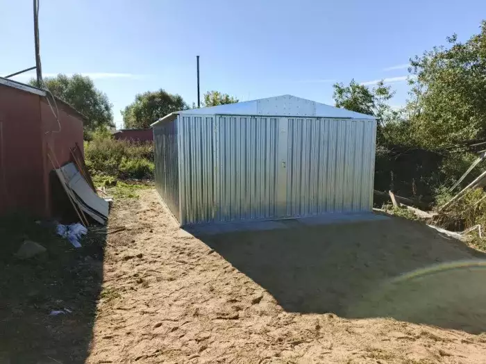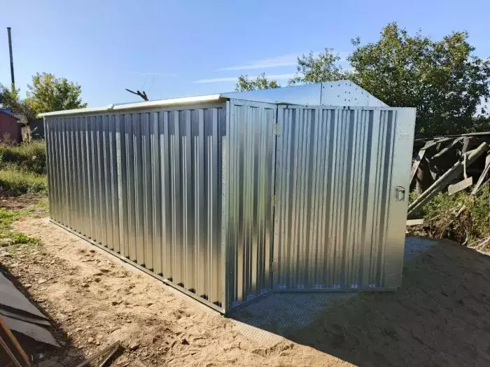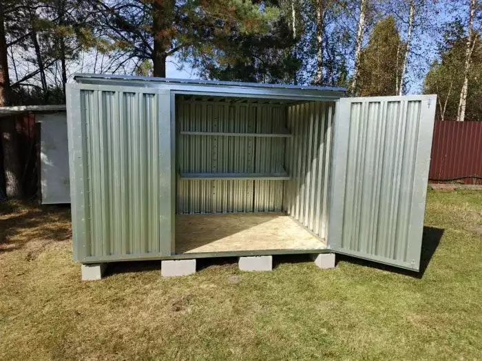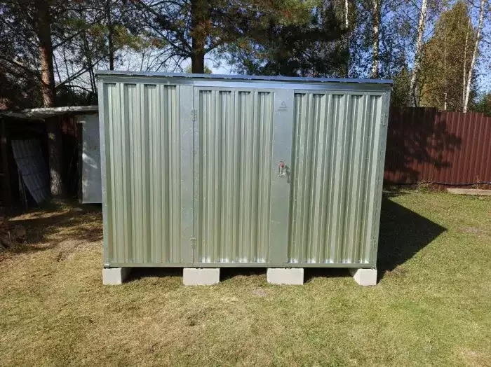 Нами была изготовлена 4-метровая конструкция с односкатной крышей и торцевой воротной группой в блестящем цинковом цвете. Дополнительно хозблок оборудовали антивандальным засовом. Теперь у злоумышленников нет шансов:)