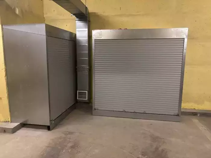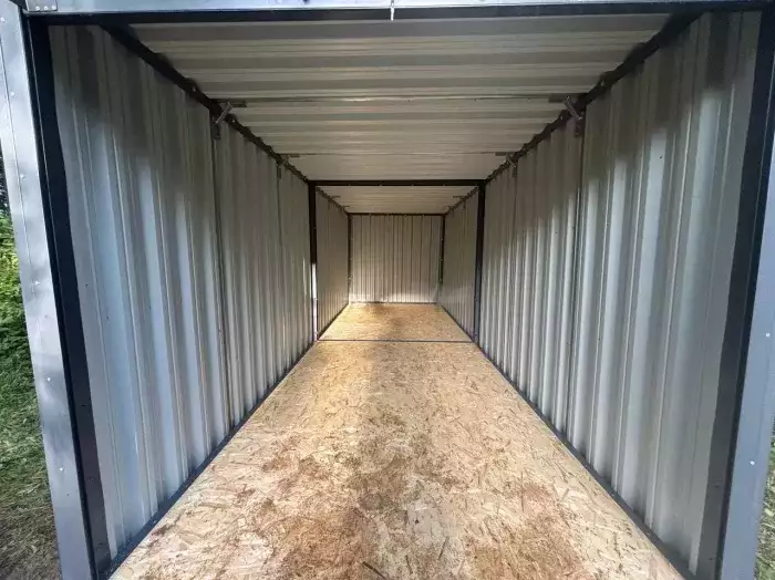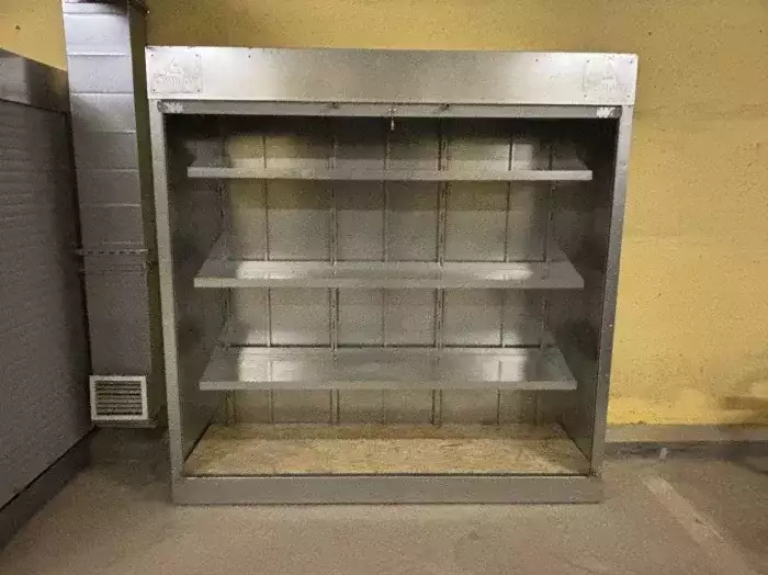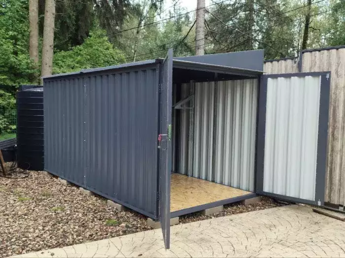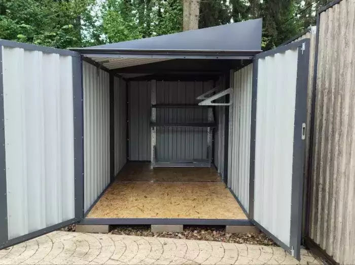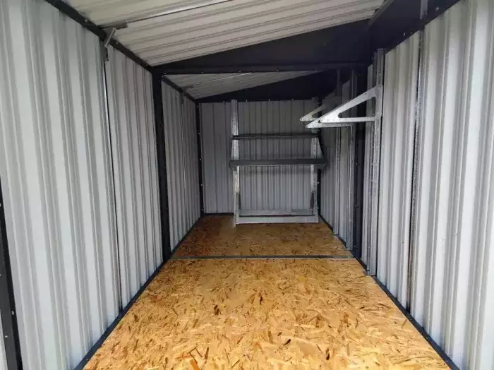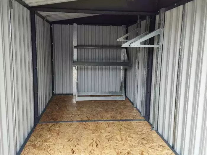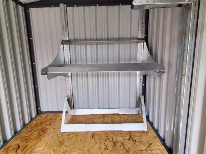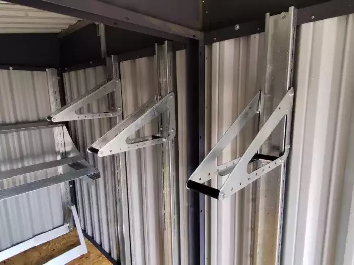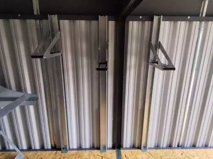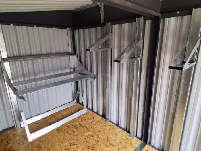 Дополнительно хозблок укомплектовали тремя прямыми стеллажами в цинке. Теперь для каждой хранящейся вещи найдется свое место.