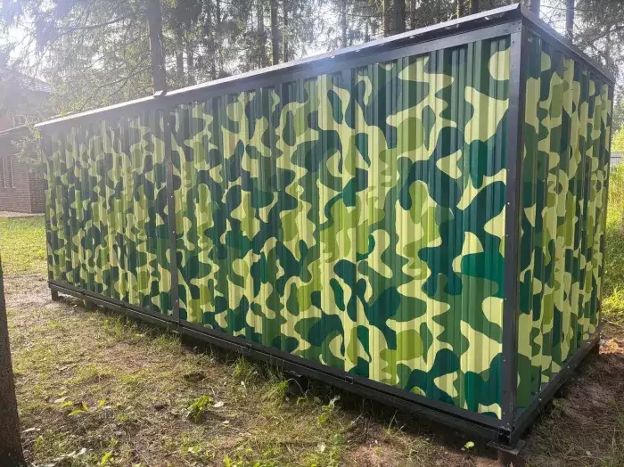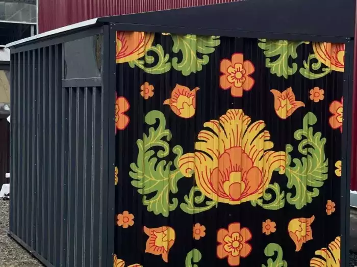 Заказчице хотелось, чтобы изделие максимально сочеталось по цветовой гамме с жилой постройкой на участке в стиле барн-хаус - светлое дерево и серая крыша. Ничего подходящего в подобной расцветке не нашли, поэтому было принято решение изготовить конструкцию в цвет забора, который тоже изготавливался параллельно нашему хозблоку.