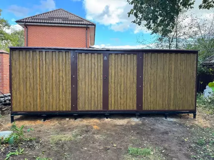 Нами была изготовлена 4-метровая конструкция с двускатной крышей и торцевой воротной группой в комбинации расцветок Наив Марун для основных элементов и RAL 7024 для фасонных элементов и крыши.