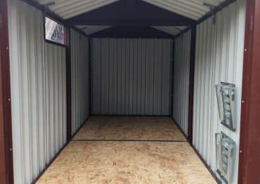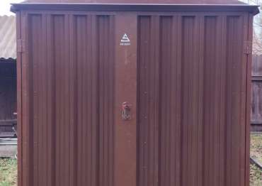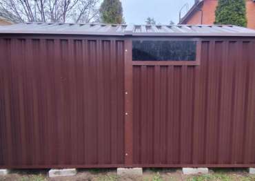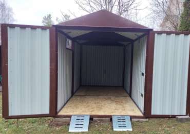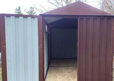 Нами была изготовлена стандартная 4-метровая конструкция с двускатной крышей и торцевой воротной группой в популярном шоколадно-коричневом цвете RAL 8017.