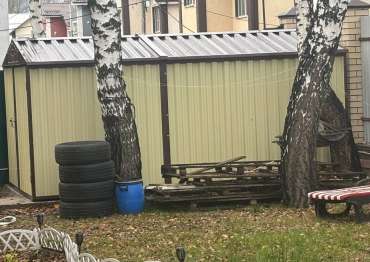Заказчику этого проекта на участок был необходим вместительный хозблок для хранения садового инвентаря, автомобильных шин и прочих хозяйственных принадлежностей. Так как установка планировалась между забором и деревом, то нужны были индивидуальные параметры.