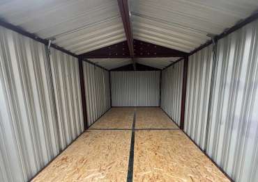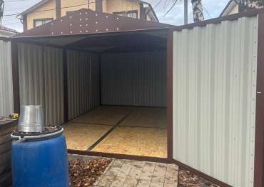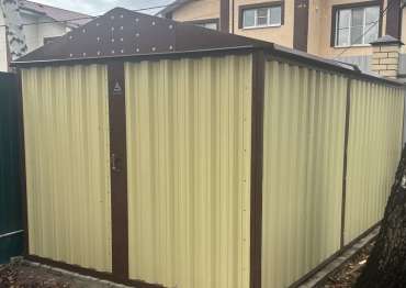 Нами была изготовлена конструкция размером 5,06 х 2,7 х 2,45 м с двускатной крышей и торцевой воротной группой в красивейшем сочетании расцветок RAL 1014 «слоновая кость» для основных элементов и шоколадно-коричневого RAL 8017 для фасонных элементов и крыши.
