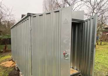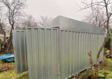 Нами была изготовлена стандартная 4-метровая конструкция с односкатной крышей и торцевой воротной группой в блестящем цинковом цвете.