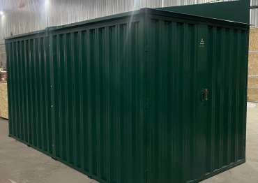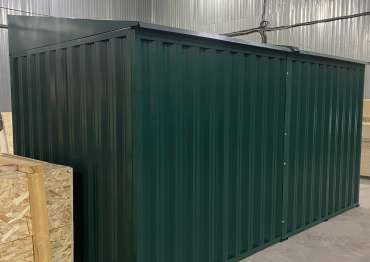 Нами была изготовлена стандартная 4-метровая конструкция с односкатной крышей и торцевой воротной группой в ярком зеленом цвете RAL 6005 «зеленый мох».