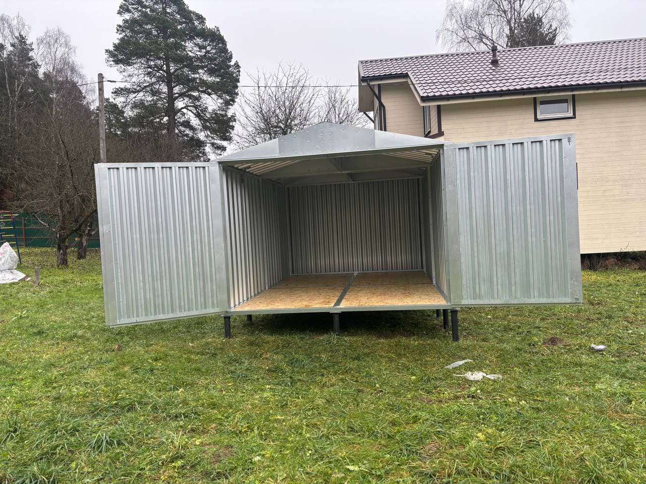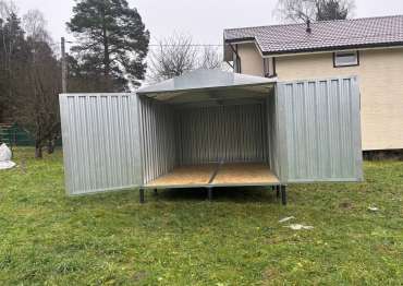 Нами была изготовлена конструкция размером 4 х 3 м с двускатной крышей и торцевой воротной группой в блестящем цинковом цвете.