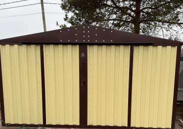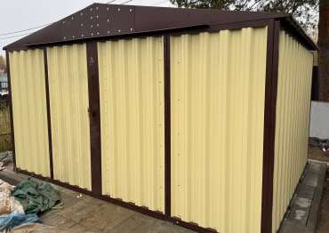 Нами была изготовлена широкая 3-метровая конструкция с двускатной крышей и торцевой воротной группой в потрясающе красивом сочетании расцветок нежного RAL 1014 «слоновая кость» для основных элементов и шоколадно-коричневого RAL 8017 для фасонных элементов и крыши. По желанию заказчика изделие выполнено из листа толщиной 0,7 мм.