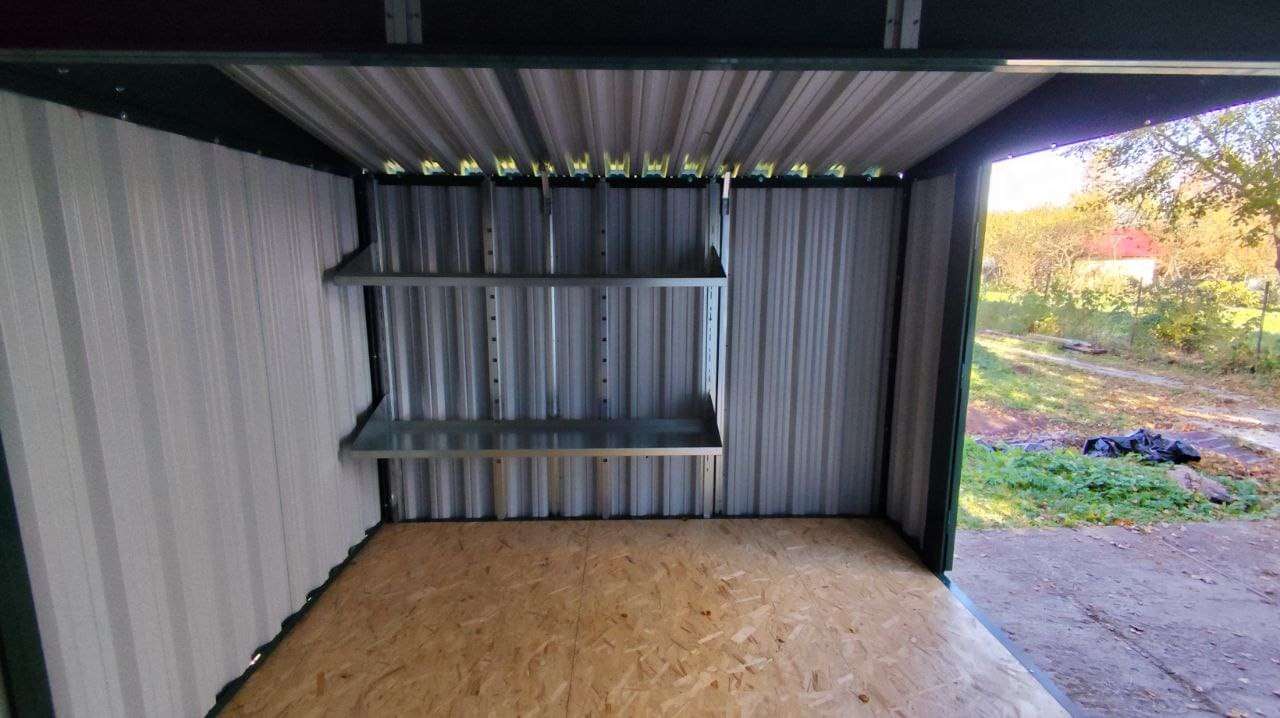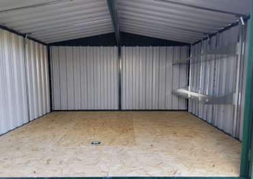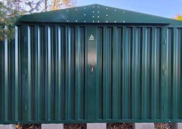 Нами была изготовлена широкая 3-метровая конструкция с двускатной крышей и торцевой воротной группой в ярком и сочном зеленом цвете RAL 6005.