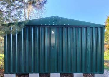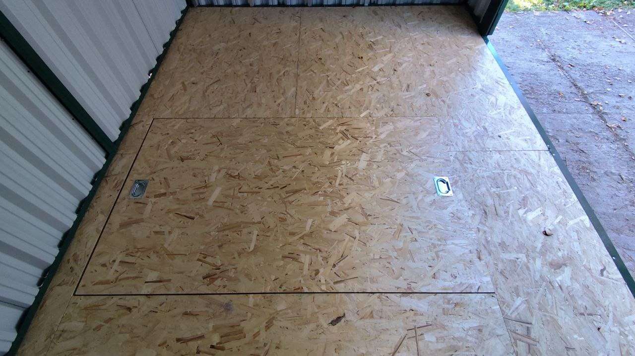 Проект: широкий 3-метровый хозблок для хранения вещей с люком для погреба в зеленом цвете.