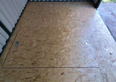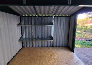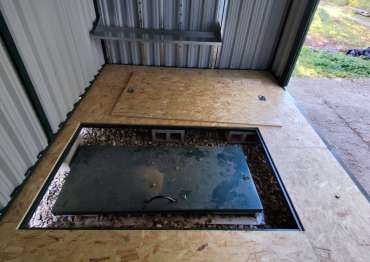 Дополнительно в полу был вырезан люк для доступа к погребу, а также установлен прямой стеллаж с двумя полками глубиной 50 см для удобного хранения различных вещей.