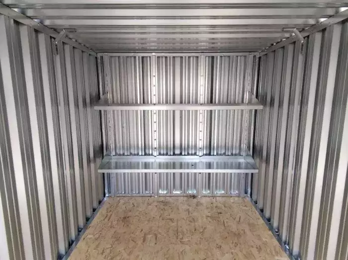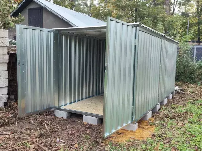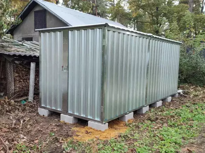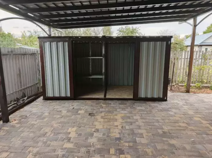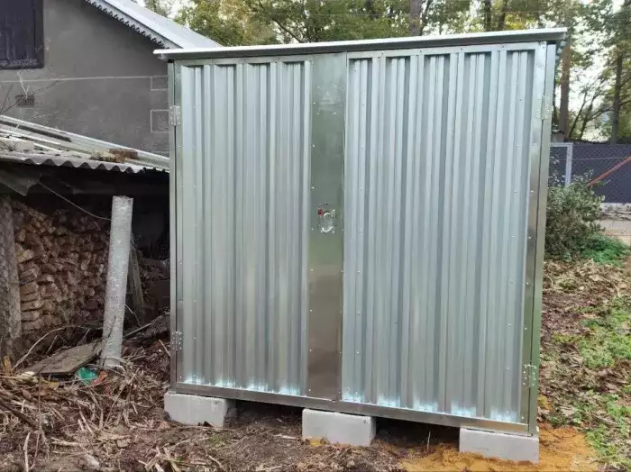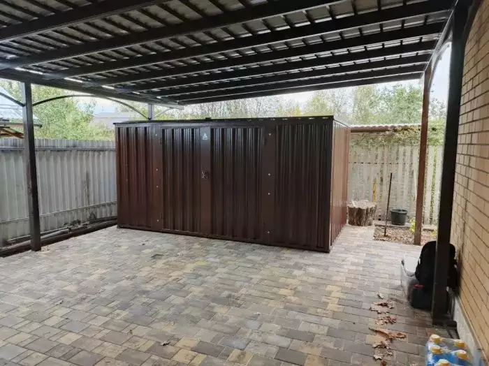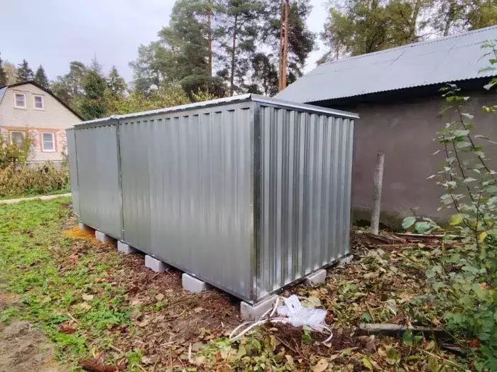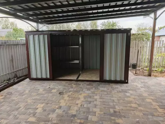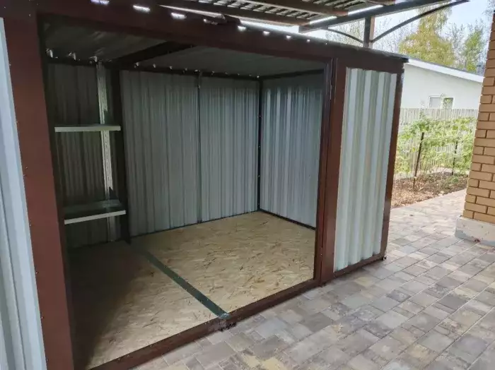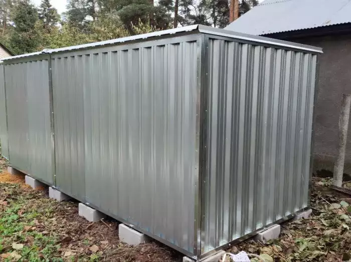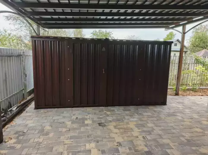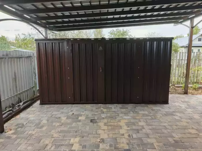 Проект: хозблок индивидуальных размеров с тремя секциями для хранения велосипедов, автомобильных колес и хозяйственных принадлежностей в цинковом цвете.