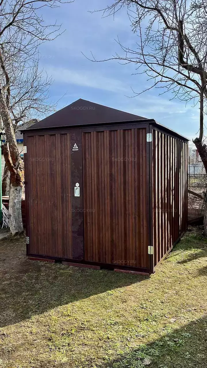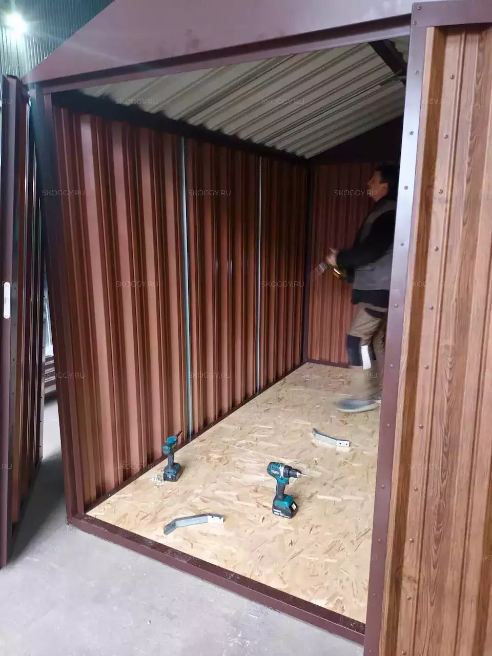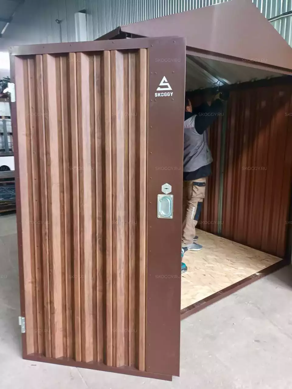 А история звездного взлета начиналась так: к нам обратился заказчик с задачей хранения мототехники. Была выбрана стандартная конструкция длиной 3 метра с двускатной крышей. Покупатель успел воспользоваться нашей акцией «Нанесение принта «под дерево» по цене окраски в цвет RAL».