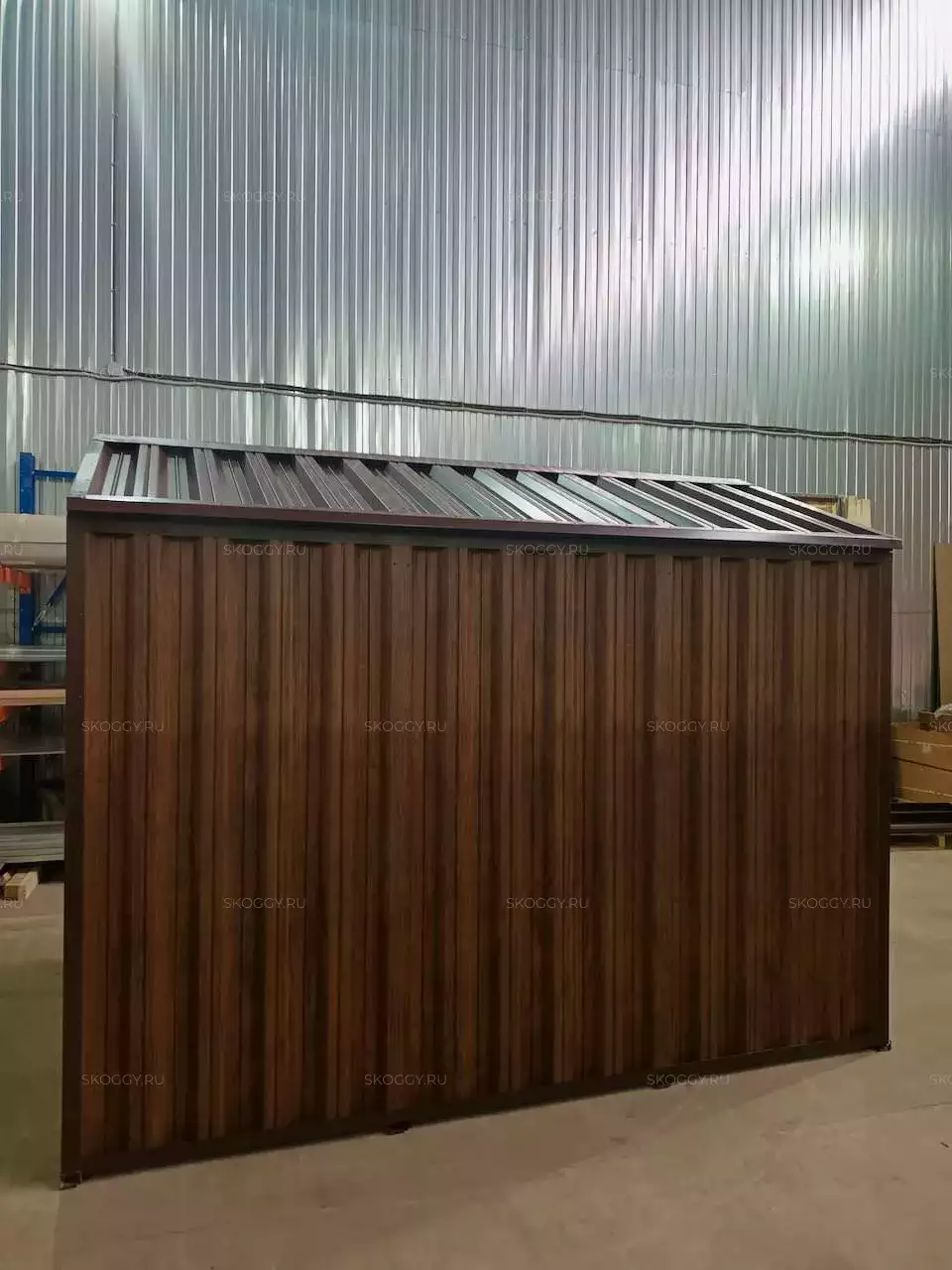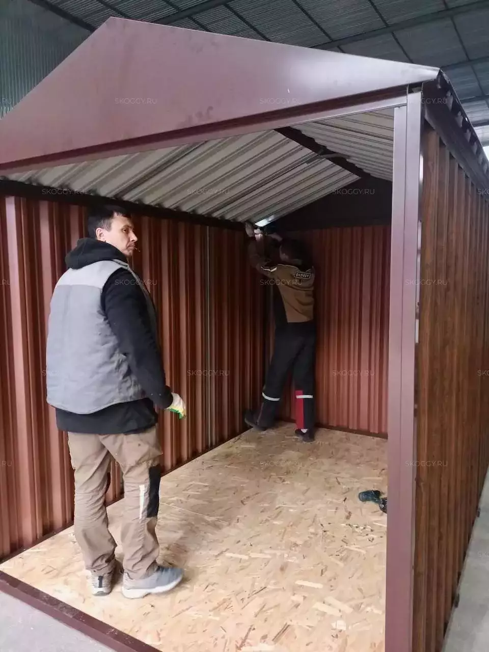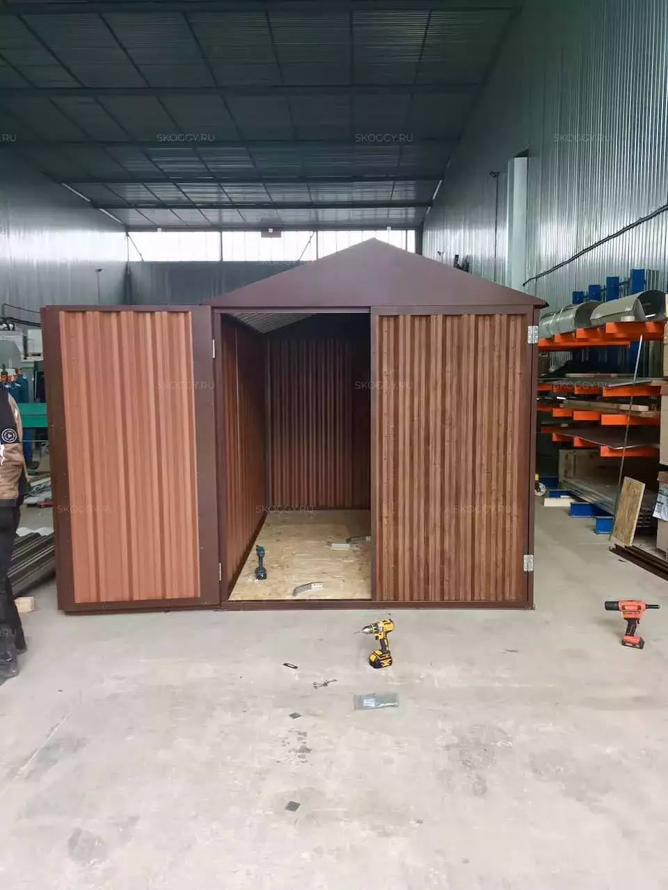 А история звездного взлета начиналась так: к нам обратился заказчик с задачей хранения мототехники. Была выбрана стандартная конструкция длиной 3 метра с двускатной крышей. Покупатель успел воспользоваться нашей акцией «Нанесение принта «под дерево» по цене окраски в цвет RAL».