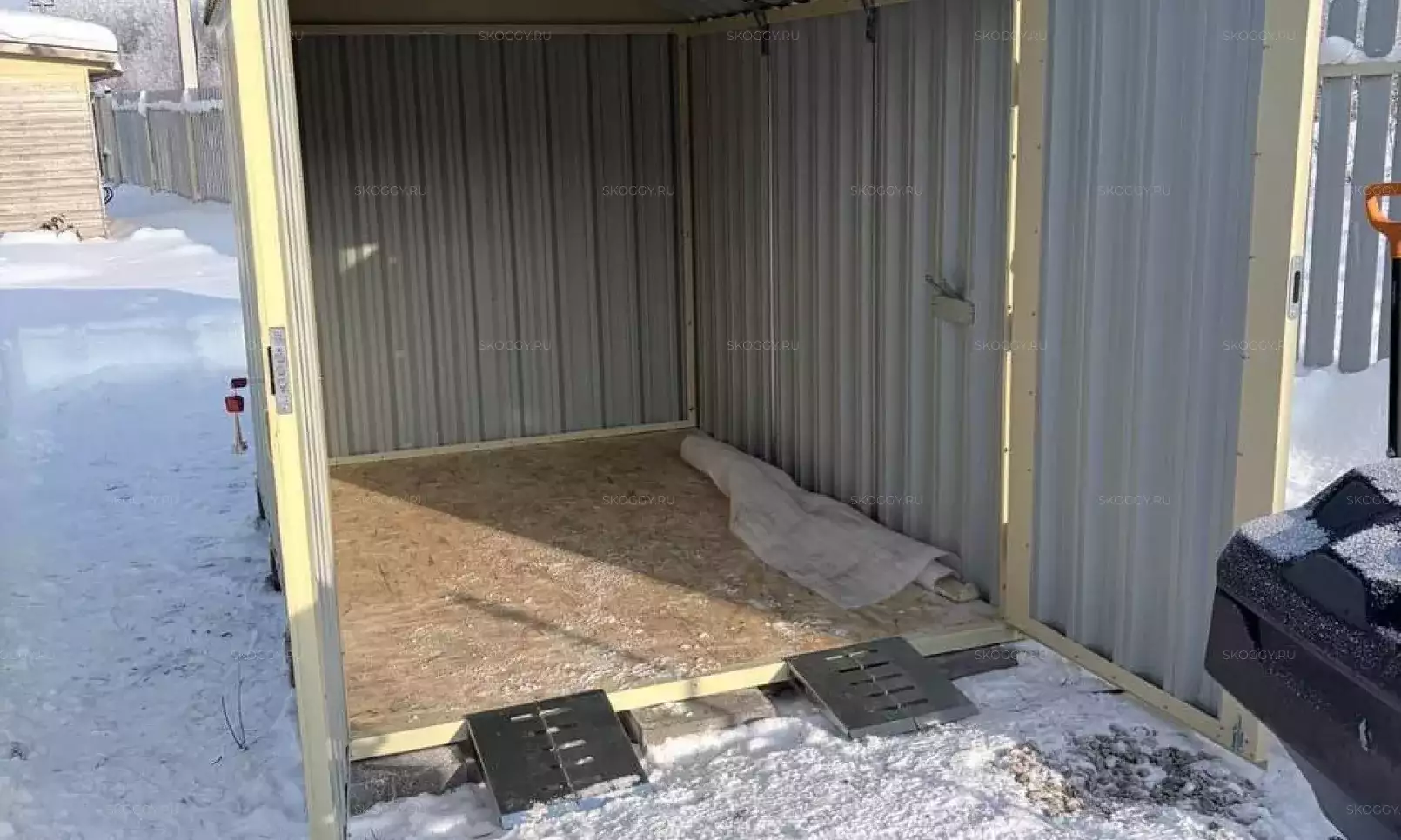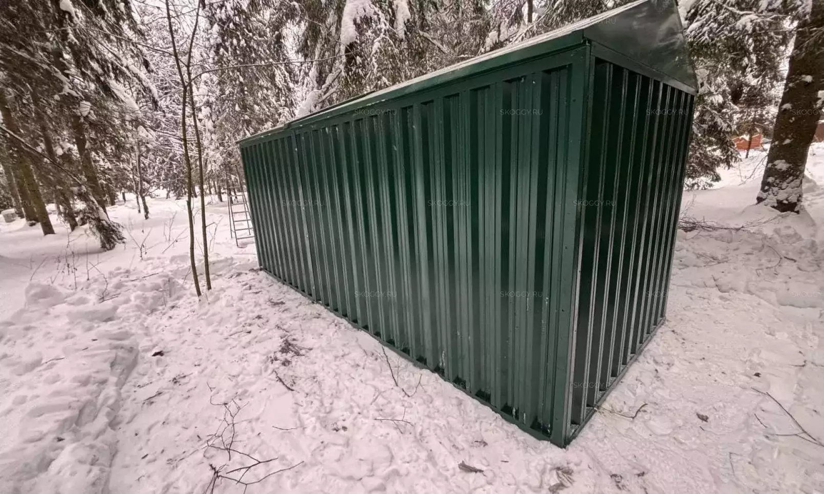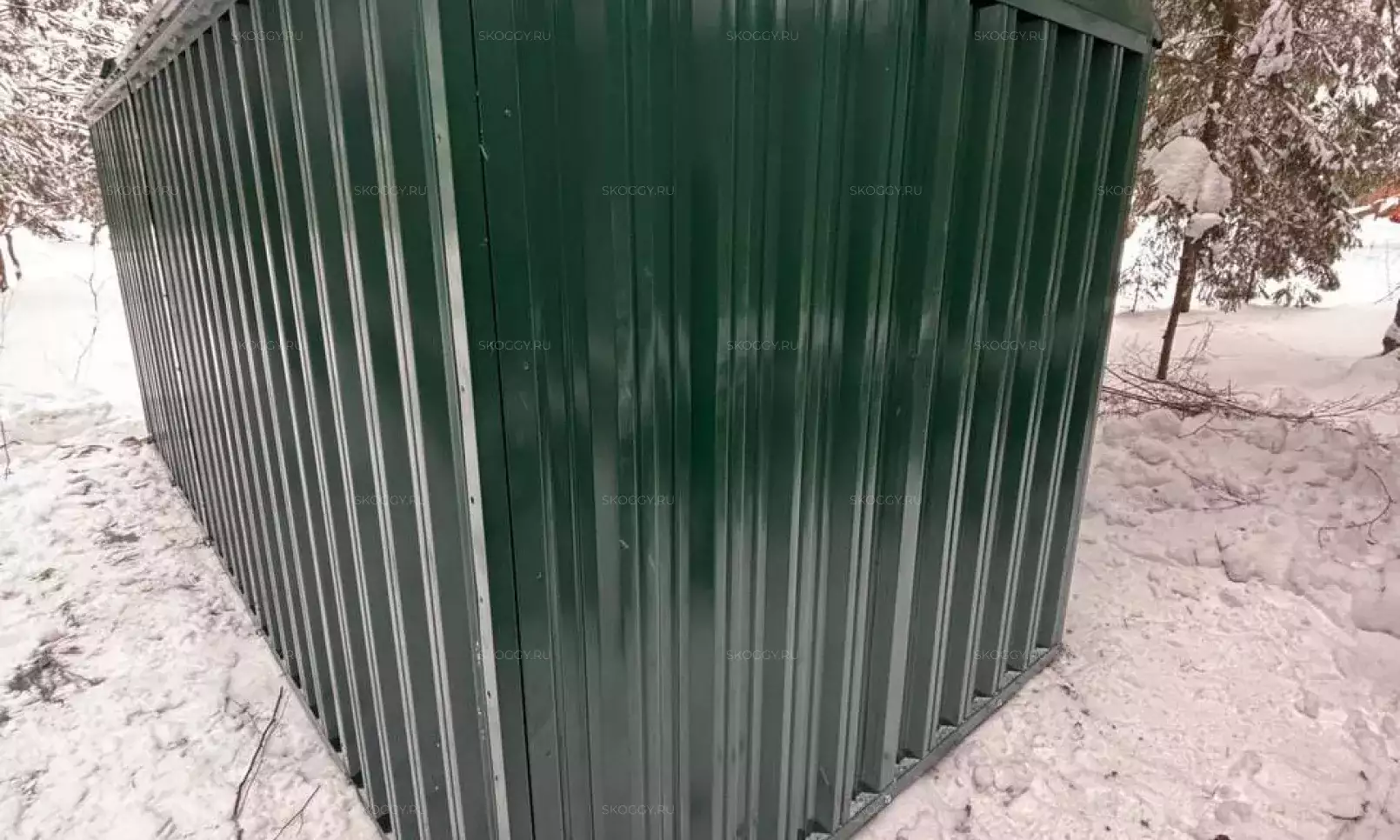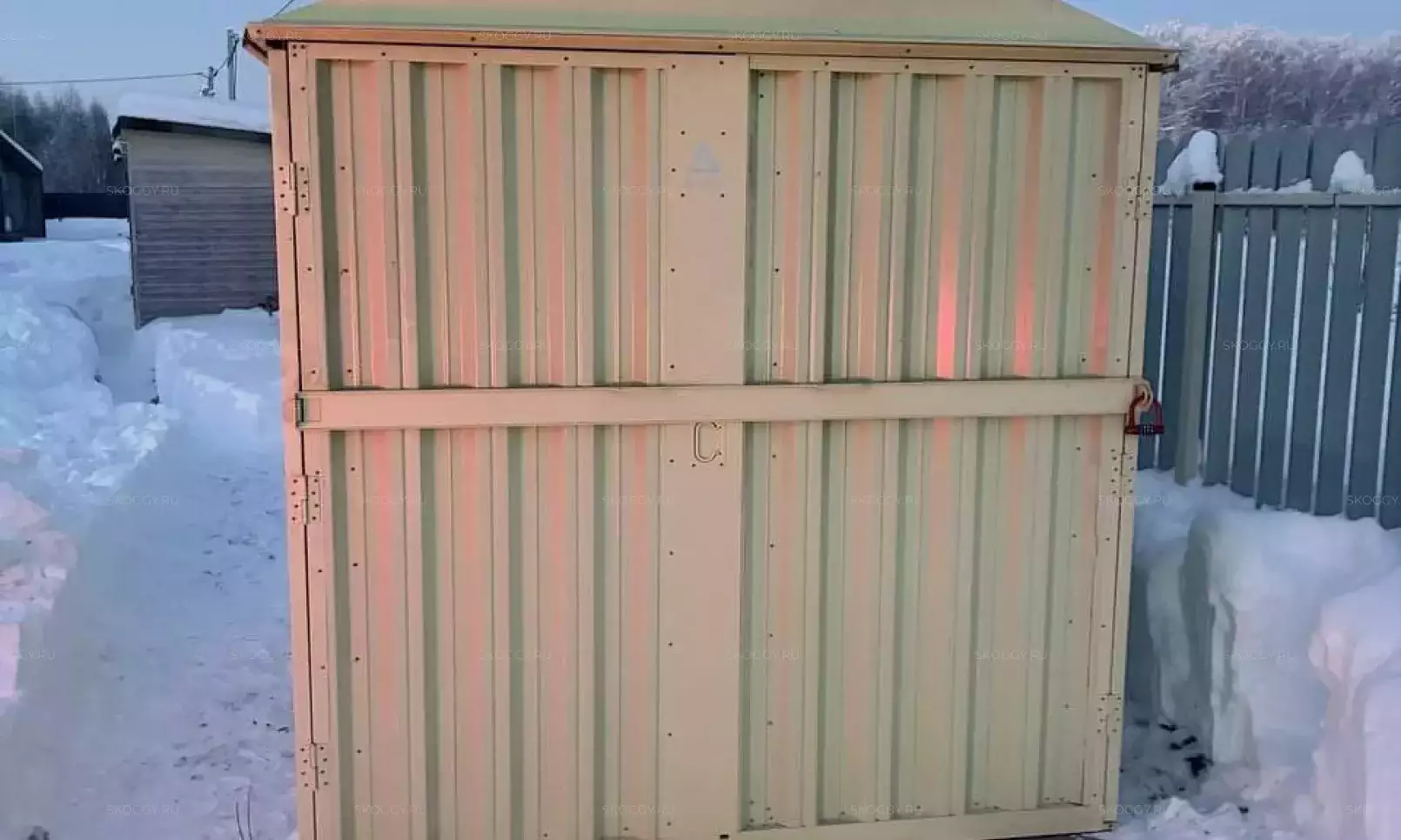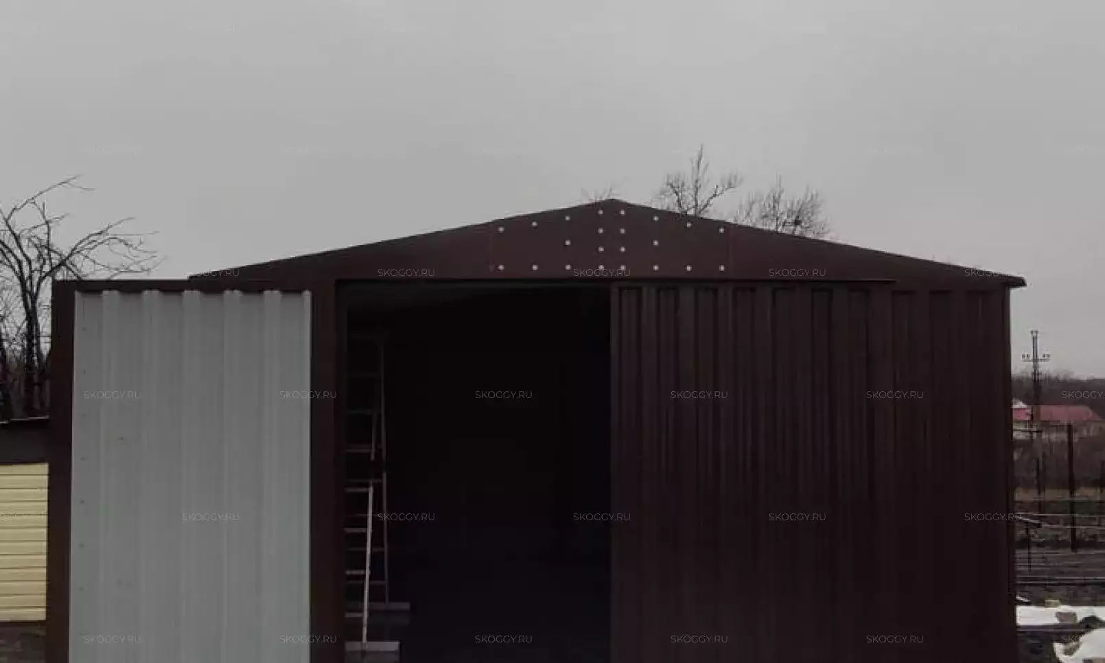 Нами была изготовлена конструкция размером 0,9 х 2,3 х 2,2 м в благородном серо-коричневом цвете RAL 8019. Именно такая расцветка была выбрана для того, чтобы изделие гармонировало по цвету с забором на участке.