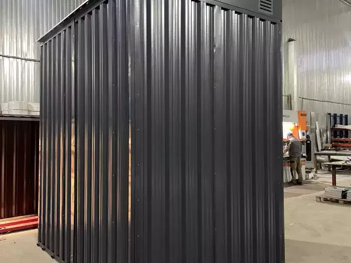 К нам обратился заказчик, которому нужен был «домик» для садовой техники и полезных на даче мелочей. Изготовили конструкцию длиной 5 м с двускатной крышей в брутальном цвете RAL 7024.