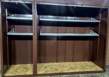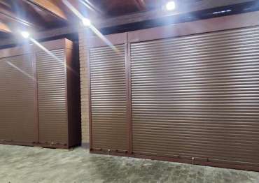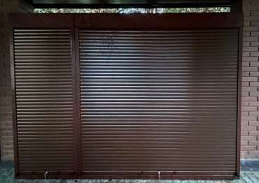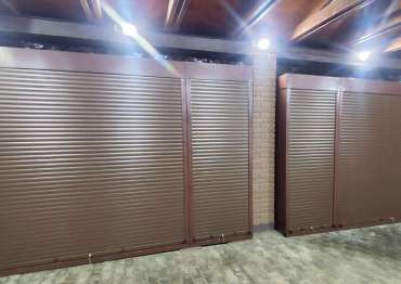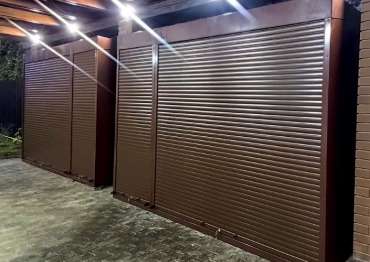 Нами была изготовлена конструкция, аналогичная предыдущей, размером 3,2 х 2,3 х 0,8 м с рольставнями в популярнейшем шоколадно-коричневом цвете RAL 8017.