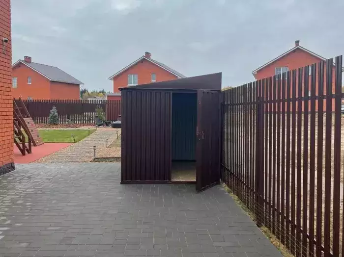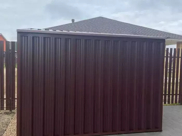 Нами была изготовлена конструкция размером 5 х 3 м с двускатной крышей и торцевой воротной группой в стильном шоколадно-коричневом цвете RAL 8017.