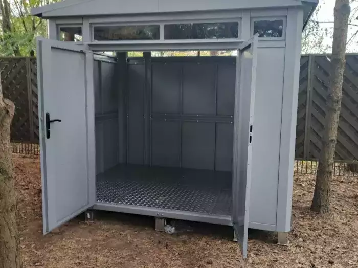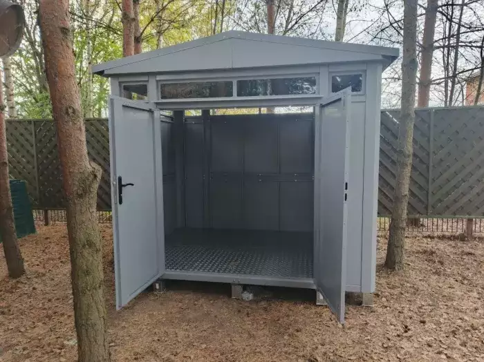 Дополнительно хозблок укомплектовали прямым стеллажом с двумя полками, упорами для распашных ворот, а также дополнительным окном размером 90 х 30 см для проникновения естественного света внутрь постройки, которое установили, по желанию заказчика, в торцевой стороне посередине.