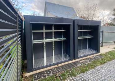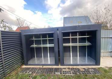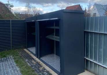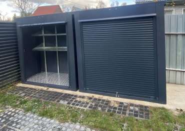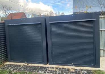 Нами были изготовлены две конструкции всепогодного шкафа размером 2,03 х 2,022 х 0,88 м с рольставнями для экономии пространства на участке в стильном и строгом графитовом цвете RAL 7024.