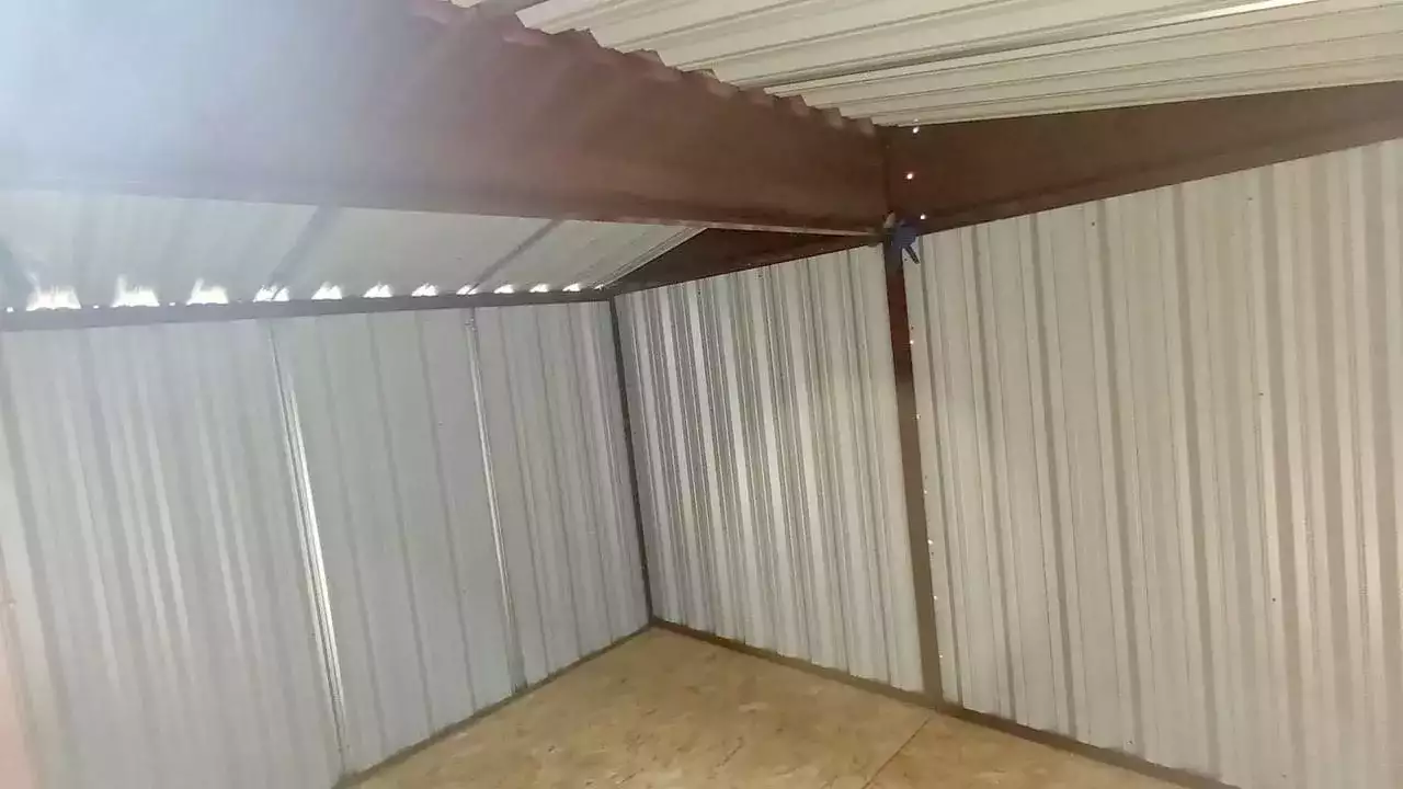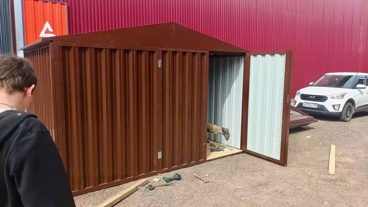 Изготовили конструкцию с двускатной крышей с увеличенной шириной 4,22 м и длиной 2,5 м. Окрас постройка получила в шоколадный цвет 8017 по каталогу RAL.
