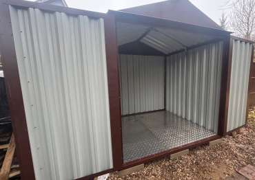 Нами была изготовлена стандартная 2-метровая конструкция с двускатной крышей и торцевой воротной группой в популярном шоколадно-коричневом цвете RAL 8017.