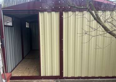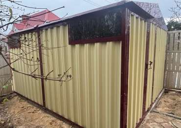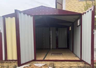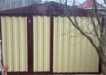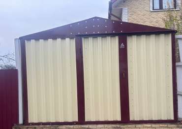Нами была изготовлена конструкция размером 4,12 х 3,5 х 2,45 м с двускатной крышей и торцевой воротной группой в потрясающем сочетании расцветок RAL 1014 «слоновая кость» для основных элементов и винно-красного RAL 3005 для фасонных элементов и крыши. Именно такая расцветка была выбрана для того, чтобы постройка гармонировала по цвету с фасадом жилого дома на участке.