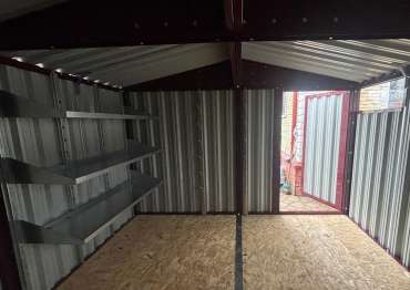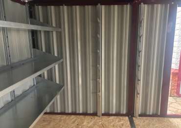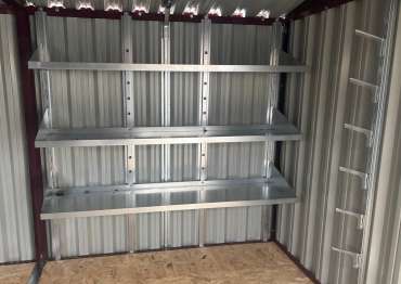 Дополнительно хозблок оборудован стеллажом с тремя полками, системой хранения инвентаря, двумя световыми окнами размером 90 х 30 см, а также дополнительной входной дверью шириной 1 м.