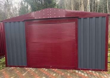 Нами была изготовлена широкая 4-метровая конструкция с двускатной крышей и торцевой входной группой с рольставнями в необычном сочетании цветов графитового RAL 7024 для основных элементов и винно-красного RAL 3005 для фасонных элементов, крыши и рольставней.